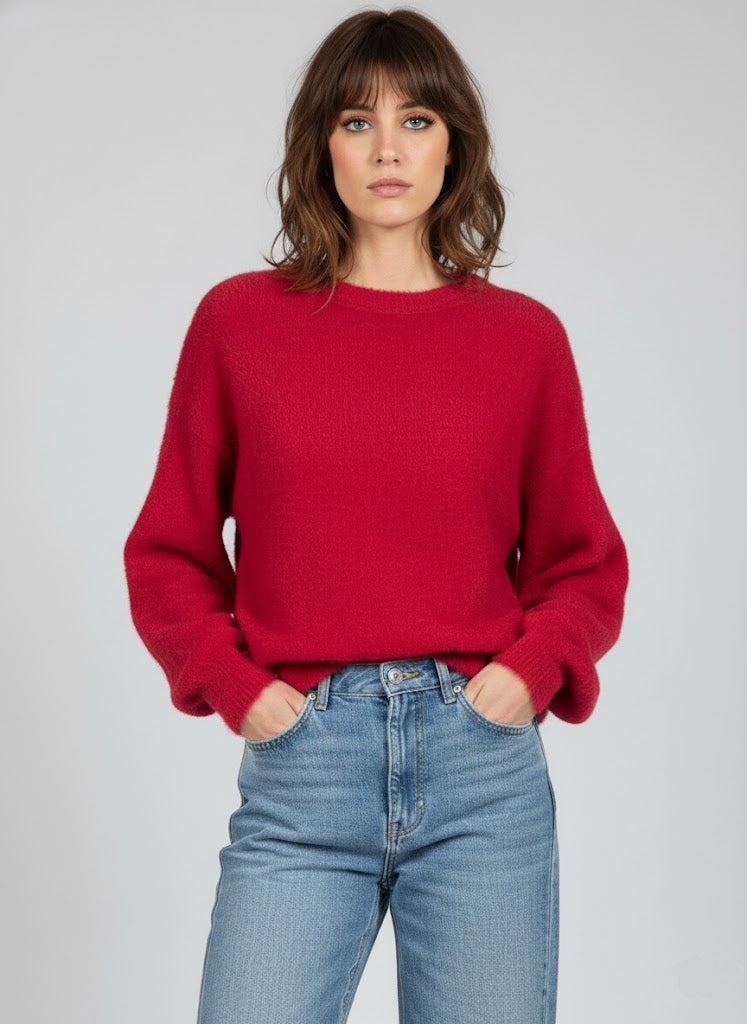 Kırmızı Balon Kollu Yumuşak Triko Kazak