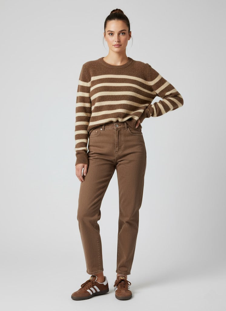 Kahverengi Krem Çizgili Triko Kazak