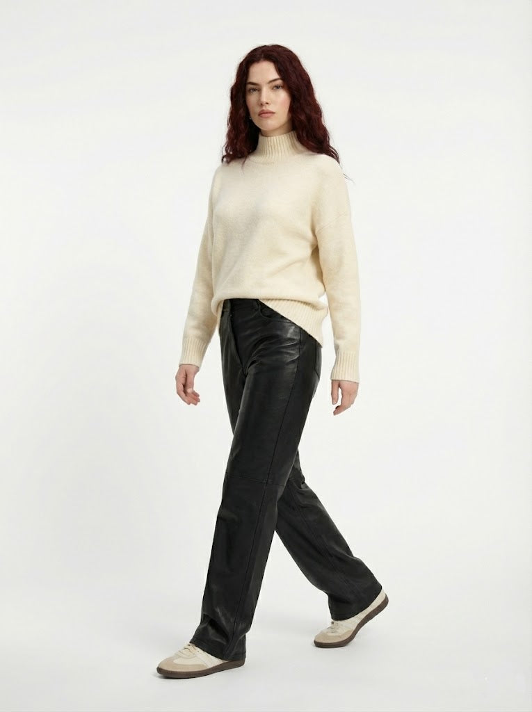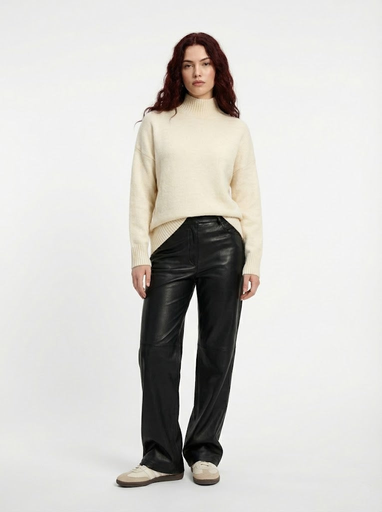 Minimalist şıklığın en konforlu hali. Bu krem rengi triko kazak, modern yarım balıkçı yaka (mock neck) tasarımıyla klasik boğazlı kazaklara ferah ve sofistike bir alternatif sunuyor.