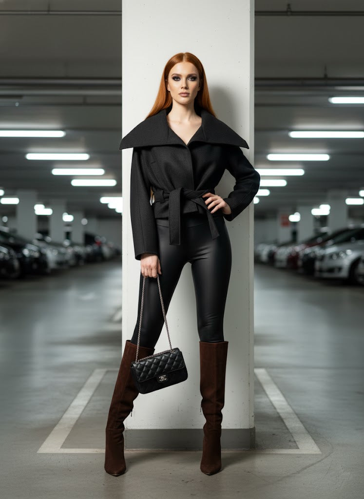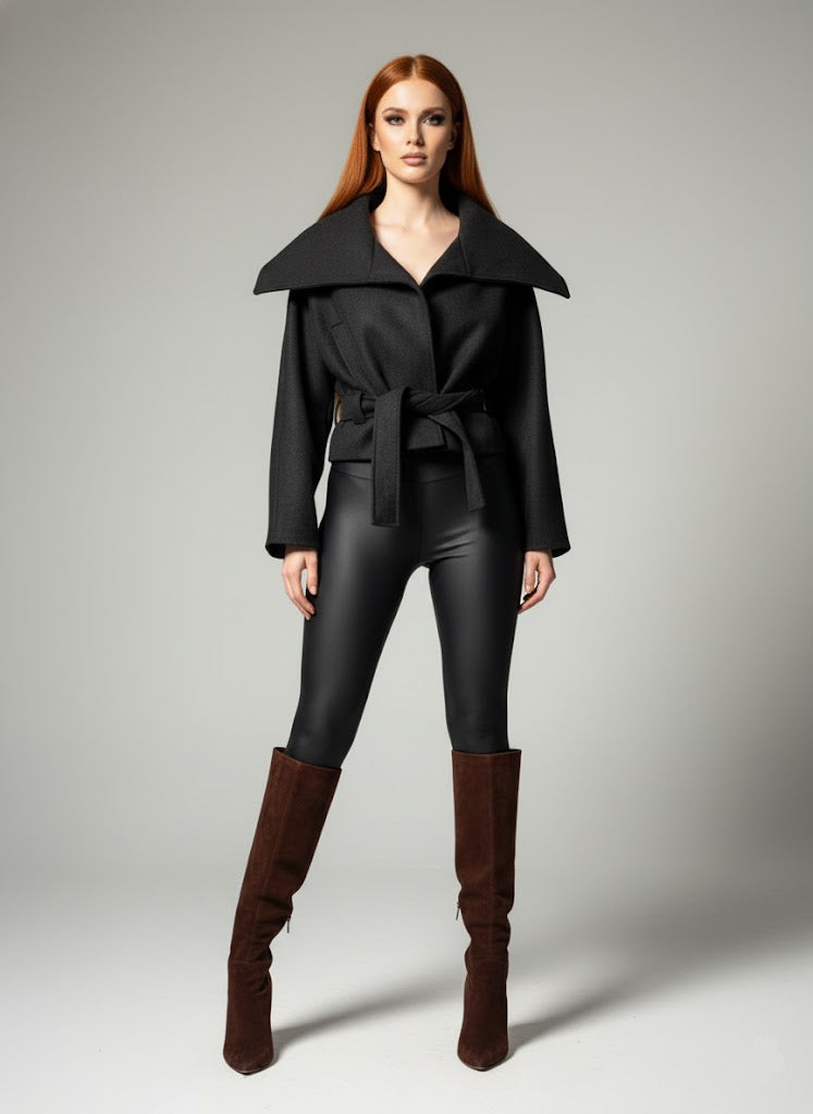 Siyahın zamansız gücü, modern bir kaşe kaban silüetiyle buluşuyor. Bu siyah kaban, geleneksel şıklığı güncel crop (kısa) kesimiyle ve temiz, düğmesiz ön paneliyle birleştirerek minimalist bir duruş sergiler.