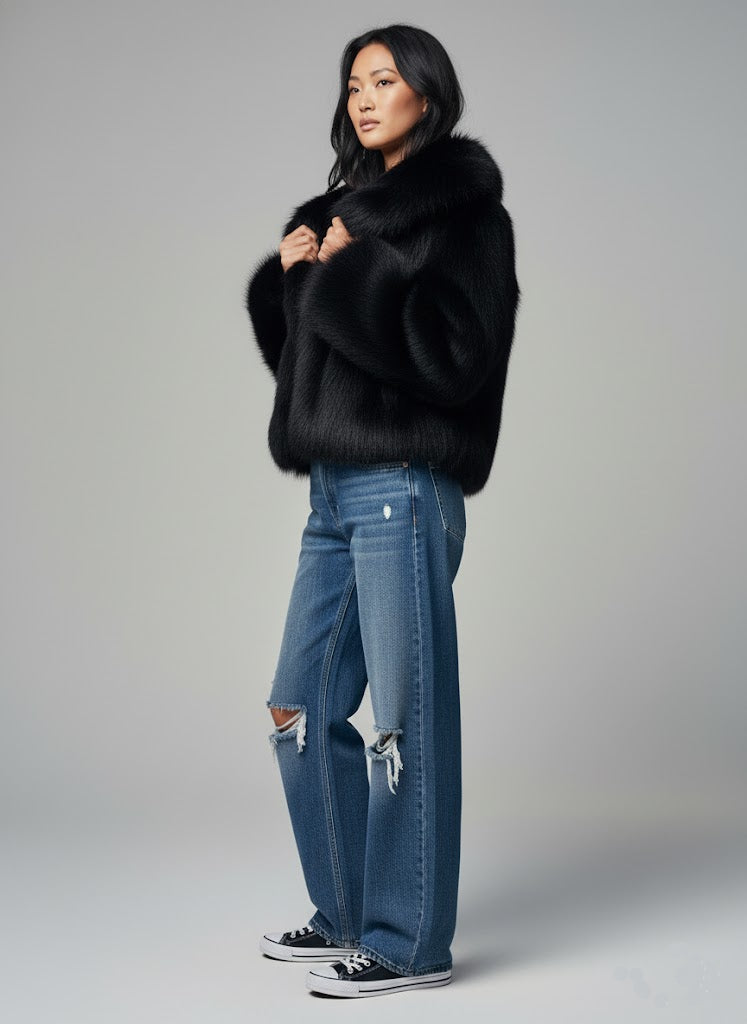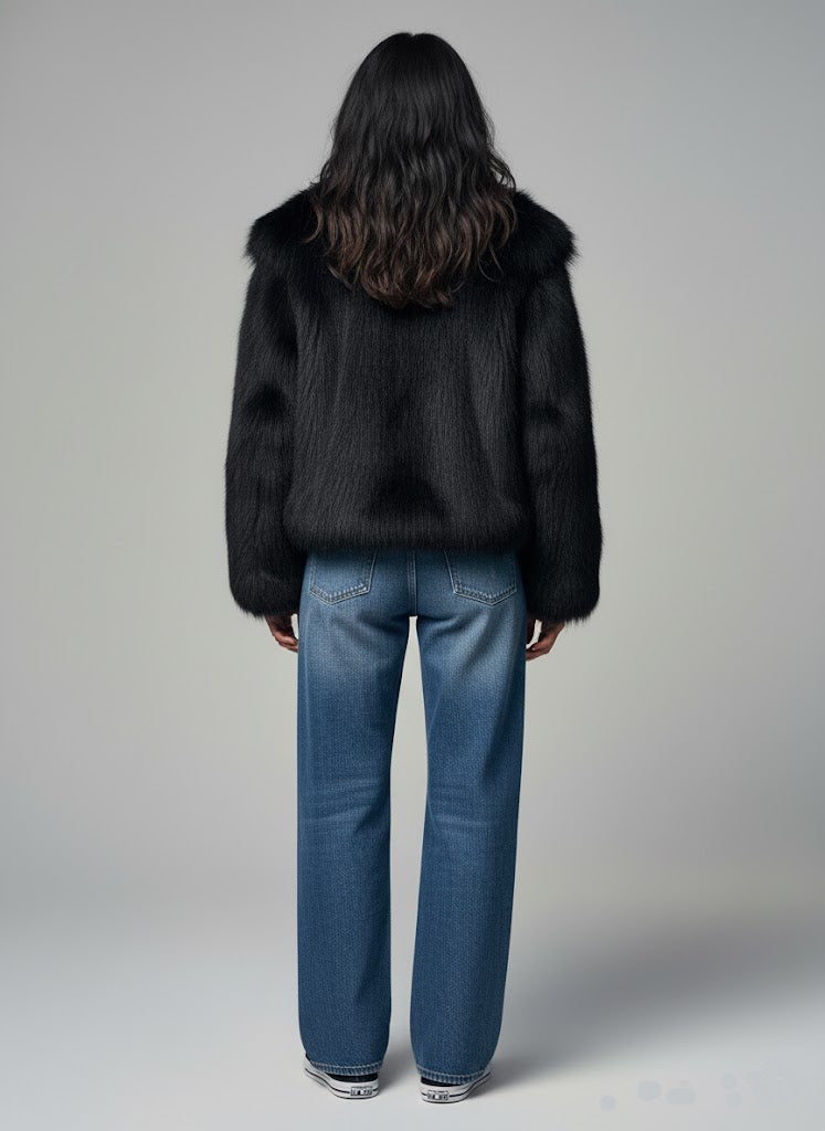 Geniş ve sofistike şal yaka detayı, omuzlardan zarifçe dökülerek lüks bir görünüm sunar. Gövdesi, olağanüstü yumuşaklıkta, yoğun ve ipeksi bir dokuya sahip premium suni kürkten üretilmiştir. Siyah rengin asaleti, kürkün zengin dokusuyla birleşerek hem gece davetleri hem de şık gündüz kombinleri için mükemmel bir temel parça oluşturur.