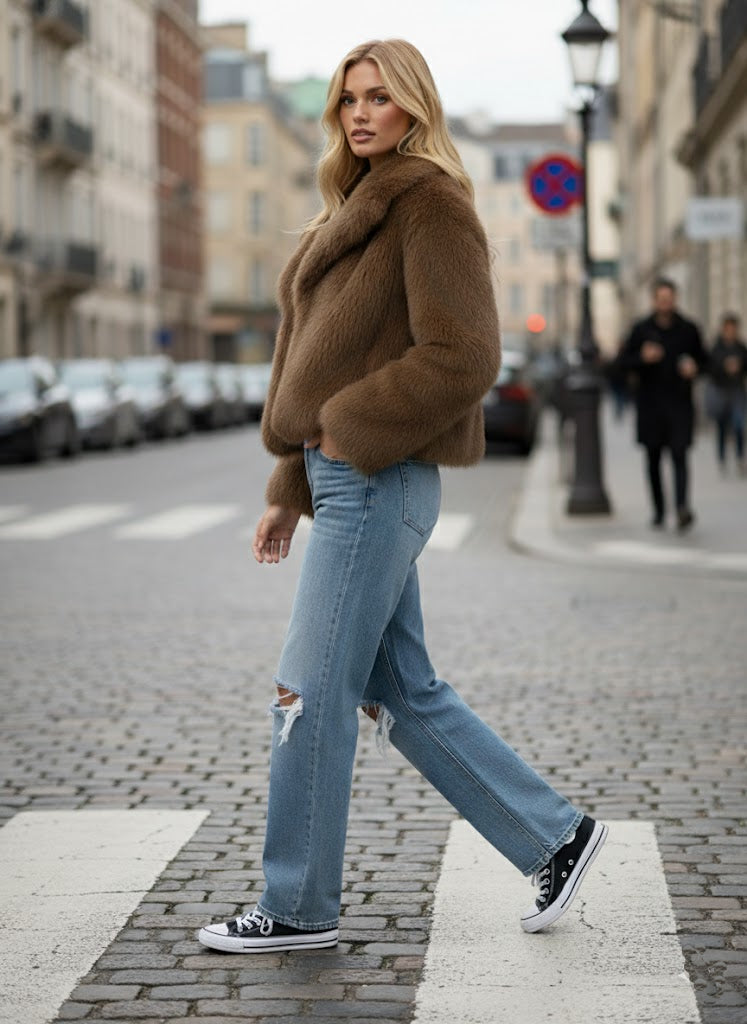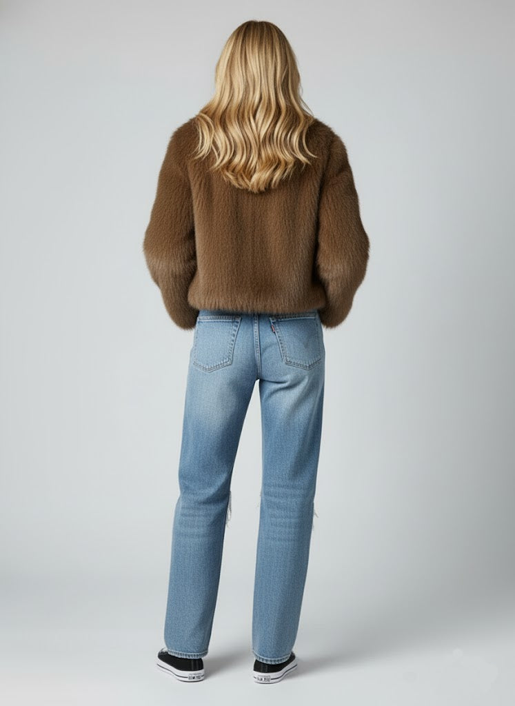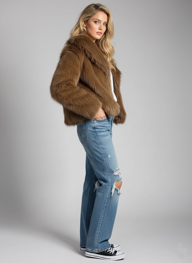 Geniş ve hacimli şal yaka detayı, omuzlardan zarifçe dökülerek lüks bir görünüm sunar. Gövdesi, olağanüstü yumuşaklıkta, yoğun ve ipeksi bir dokuya sahip premium suni kürkten üretilmiştir. Kahverenginin zengin ve doğal tonu, kürkün parlak dokusuyla birleşerek hem gündelik denim kombinlerine hem de özel davet görünümlerine zahmetsiz bir uyum sağlar.